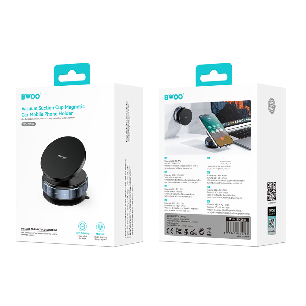 A BWOO BO-ZJ138 egy fekete, mágneses telefontartó, amelyet vákuumos tapadókoronggal lehet biztonságosan rögzíteni autóban vagy más sima felületeken. A 360 fokban elforgatható gömbcsukló lehetővé teszi a rugalmas pozicionálást.